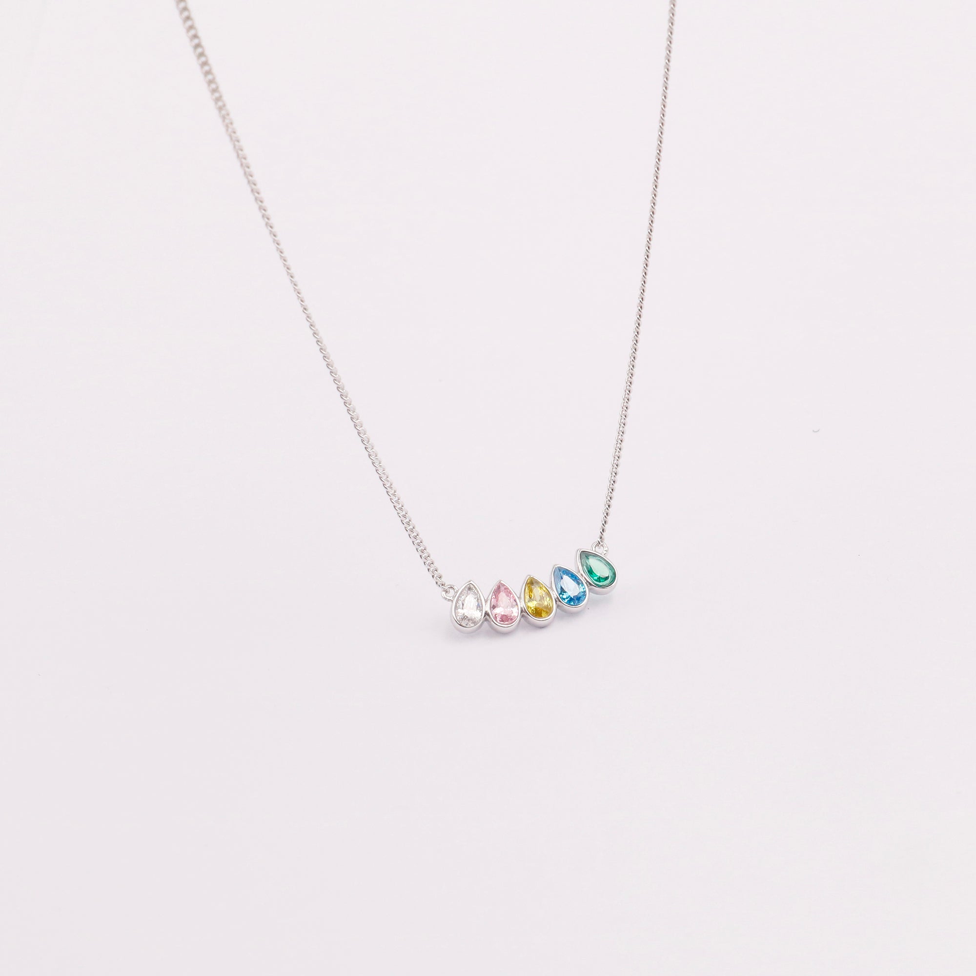 This design necklace was made by solid sterling silver, set with 5 A CZ stones. each stone size is 3 mm by 6 mm. the chain thickness is 1.4 mm. available in silver,gold and rose gold color. and also available many chain lengths.